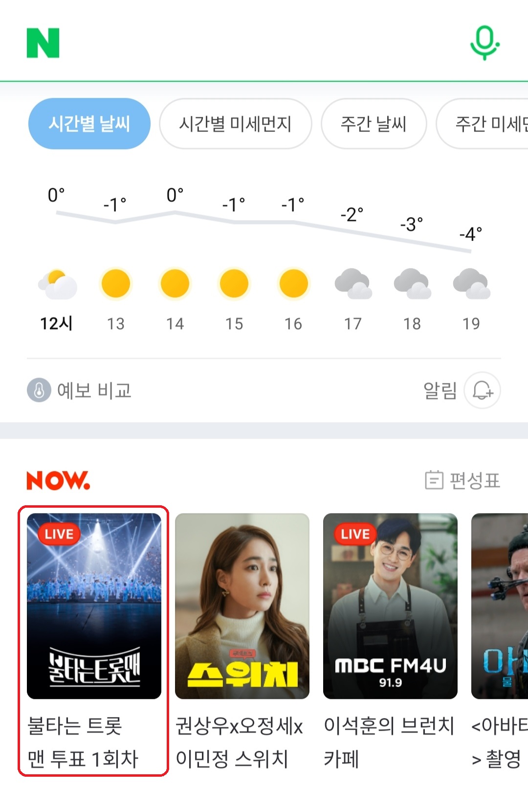 5. 마지막 방법은 네이버 앱 첫 화면에서 스크롤을 내려 날씨 아래 나오는 "불타는 트롯맨"을 클릭합니다.