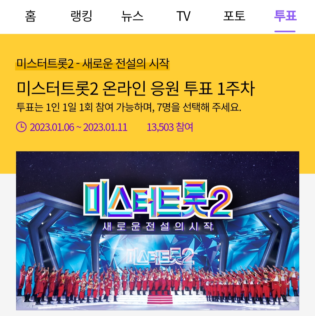 5. 미스터트롯2 배너를 클릭하면 응원투표 페이지로 이동합니다.