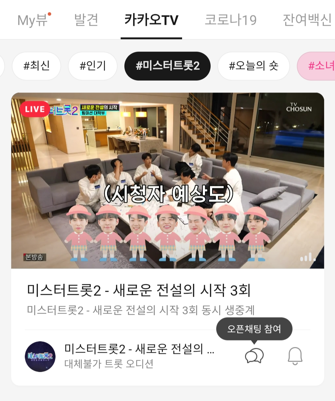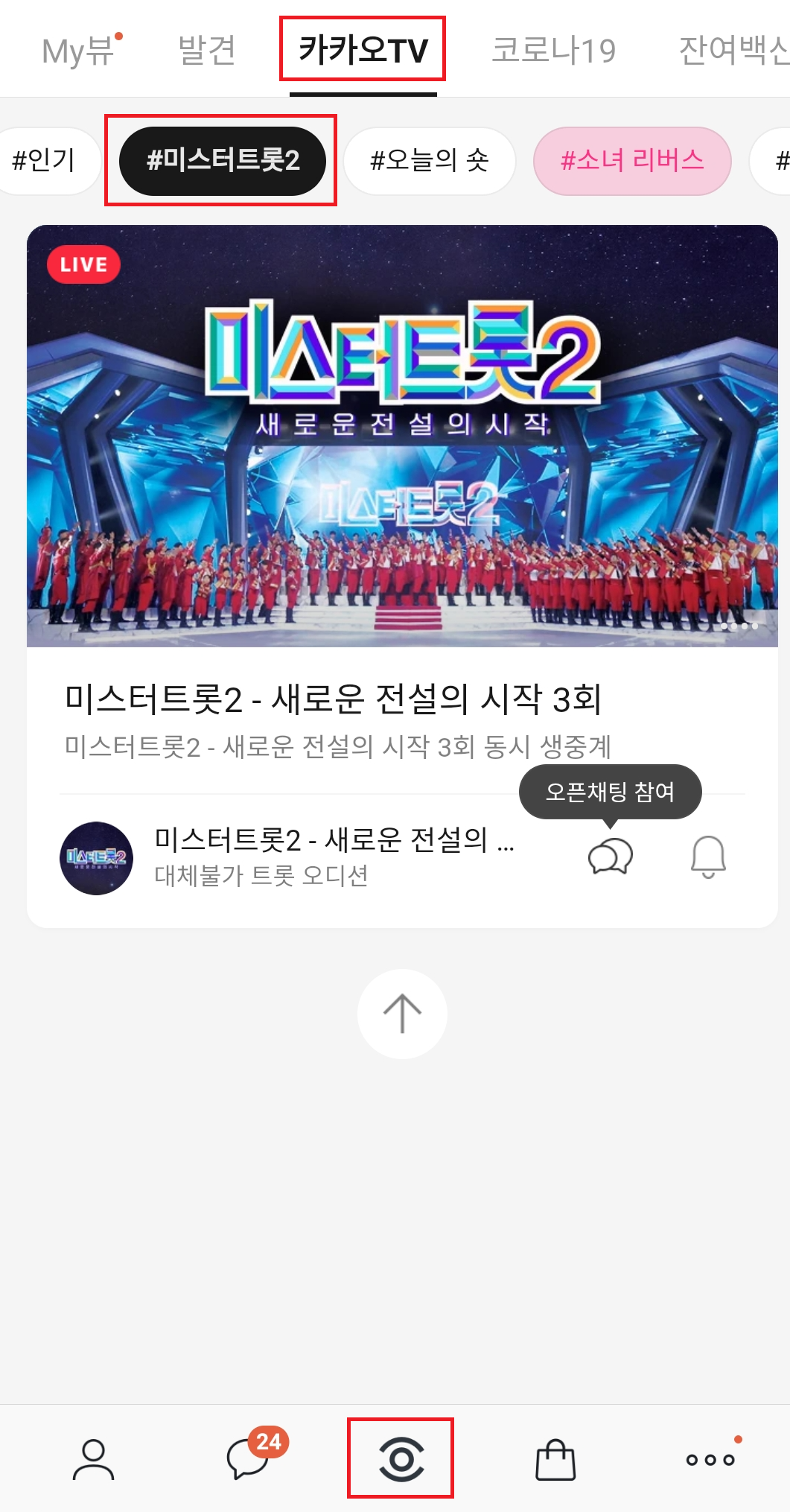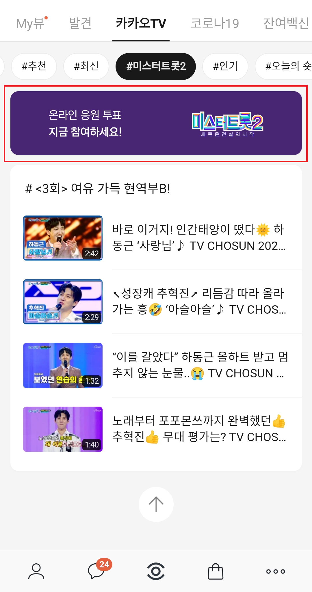 3. 상단의 "카카오 TV"로 들어가 "#미스터트롯2"를 클릭합니다.