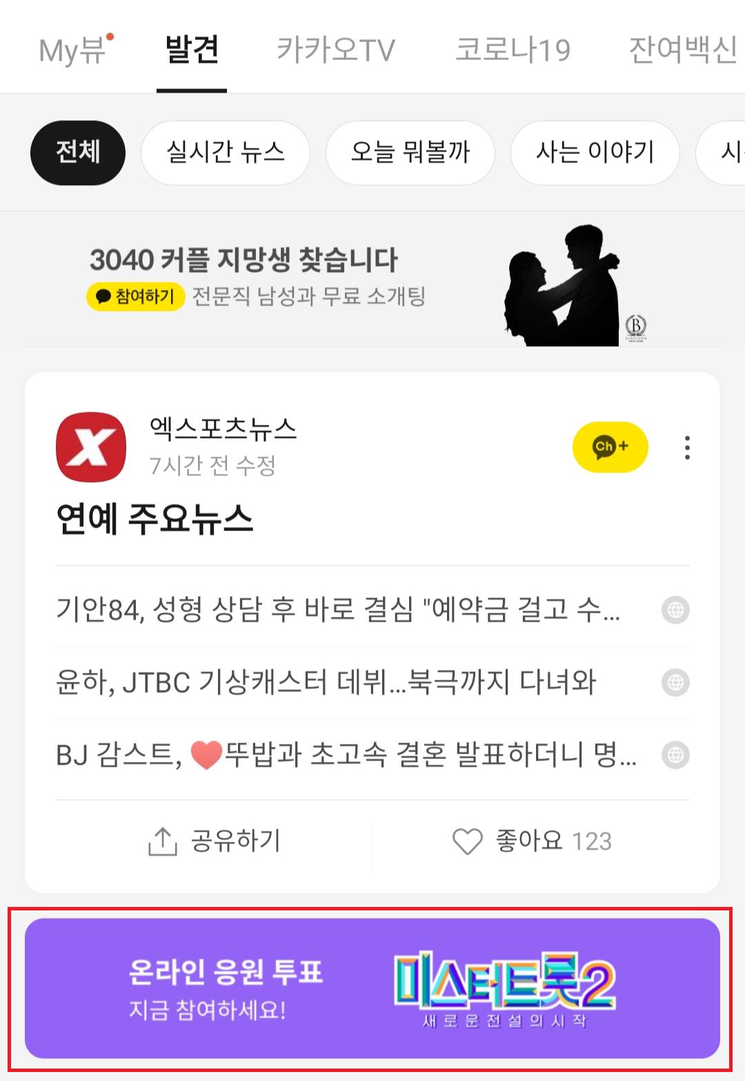 또는 처음에 눈 모양 아이콘을 클릭하여 들어간 페이지에서 스크롤을 내려 "미스터트롯2" 배너를 찾아 클릭하셔도 됩니다.