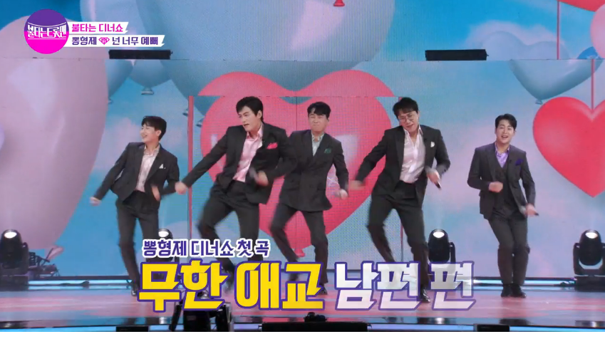 불타는 디너쇼 팀 메들리전의 첫 무대를 연 팀은 '뽕형제'입니다. 뽕형제는 1:1 라이벌전에서 3위를 한 황영웅이 결성한 팀으로 함께 한 멤버는 민수현, 신명근, 정다한, 춘길입니다. 이 팀의 주세는 "아내를 위한 세레나데"로 신명근의 트레이드 마크인 망토와 국자가 제대로 한 몫(?)했는데, 매우 유쾌한 무대였습니다. 연예인 대표단에게서는 115점, 국민 대표단으로부터는 196점을 받아 총점 311점을 받았으며, 이는 앞으로 나머지 팀을 평가하는 기준이 되었어요.