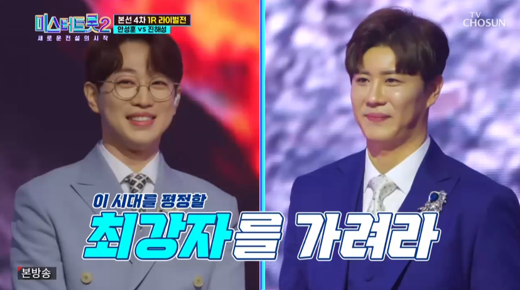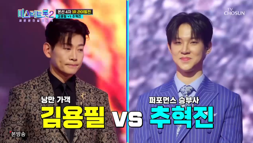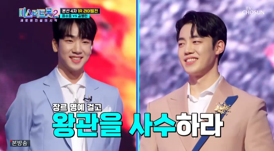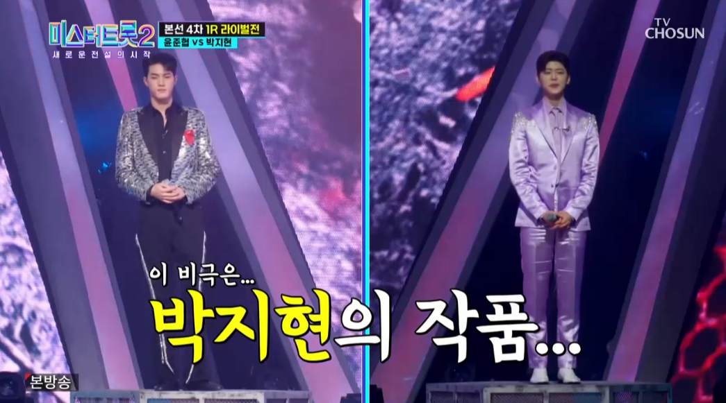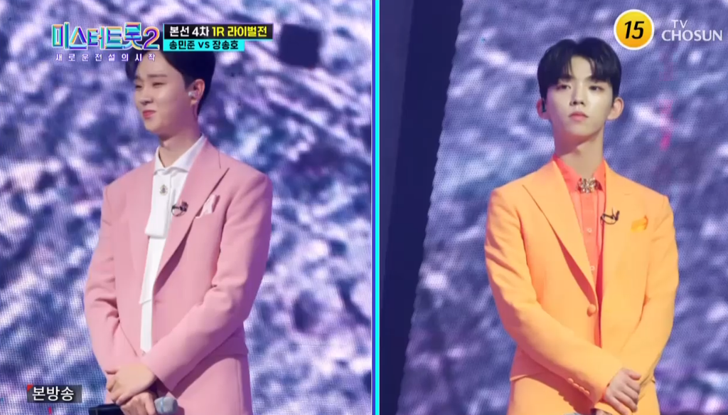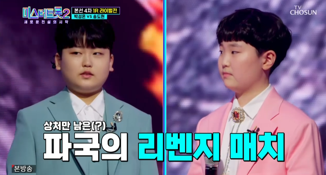 이 대결은 끝까지 지목 당하지 못하고 남겨진 둘이 짝인 된 것 같아요. 둘이 한 곡 듀엣 대결도 함께 할 텐데 미스터트롯1 때의 장민호와 정동원 군이 생각나는 조합입니다.^^