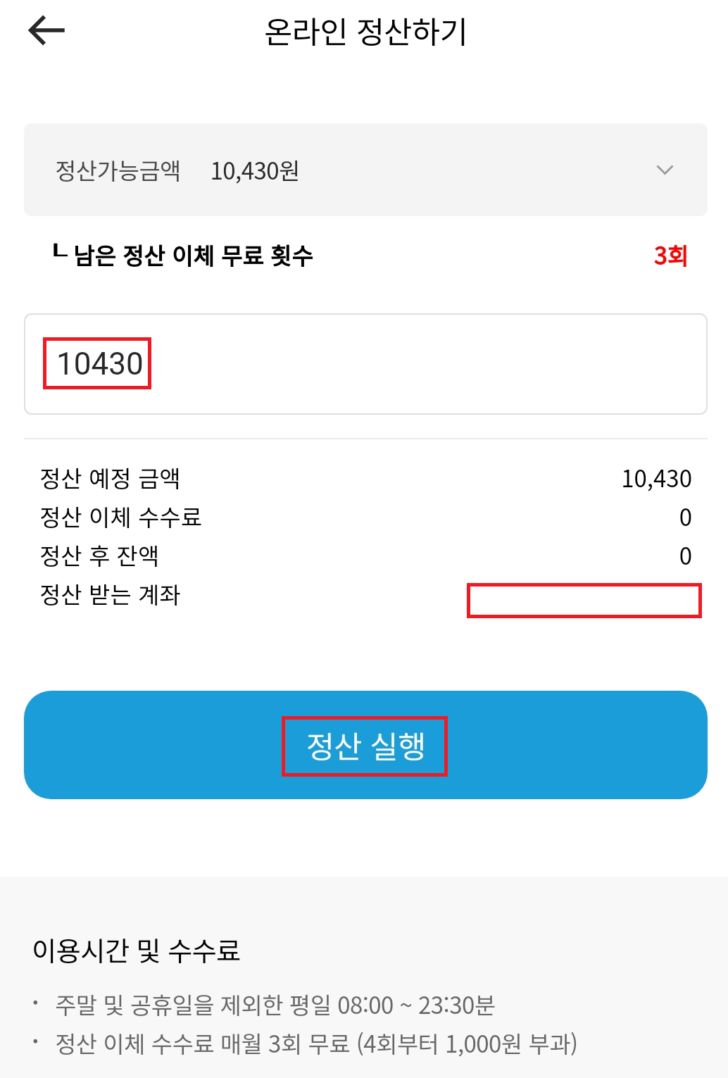 ** 정산 이용시간은 주말 및 공휴일을 제외한 평일 아침 8시부터 밤 11시 30분까지입니다.