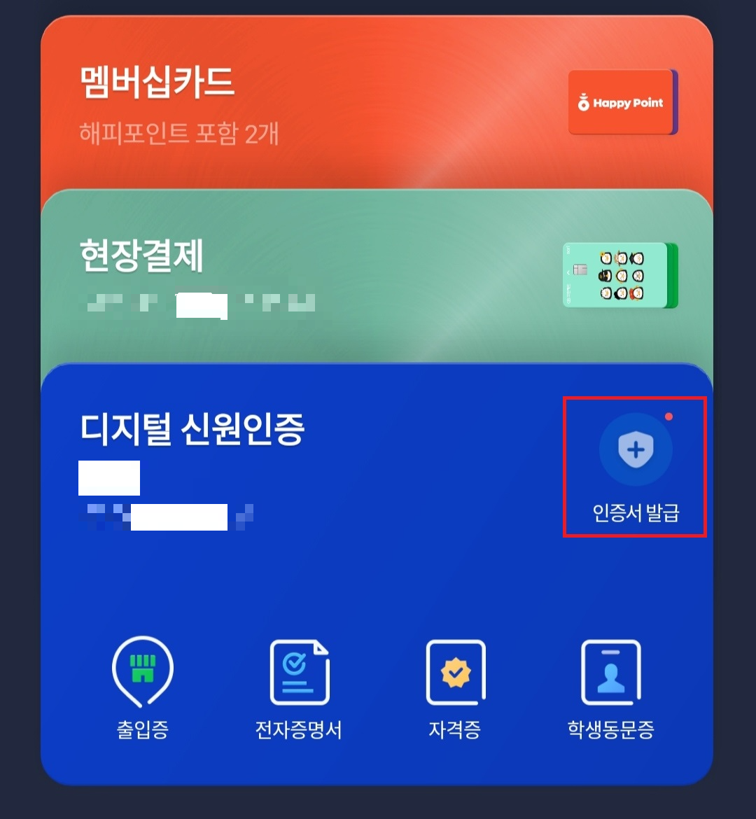 2. '디지털 신원인증'에서 '인증서 발급'을 클릭합니다.