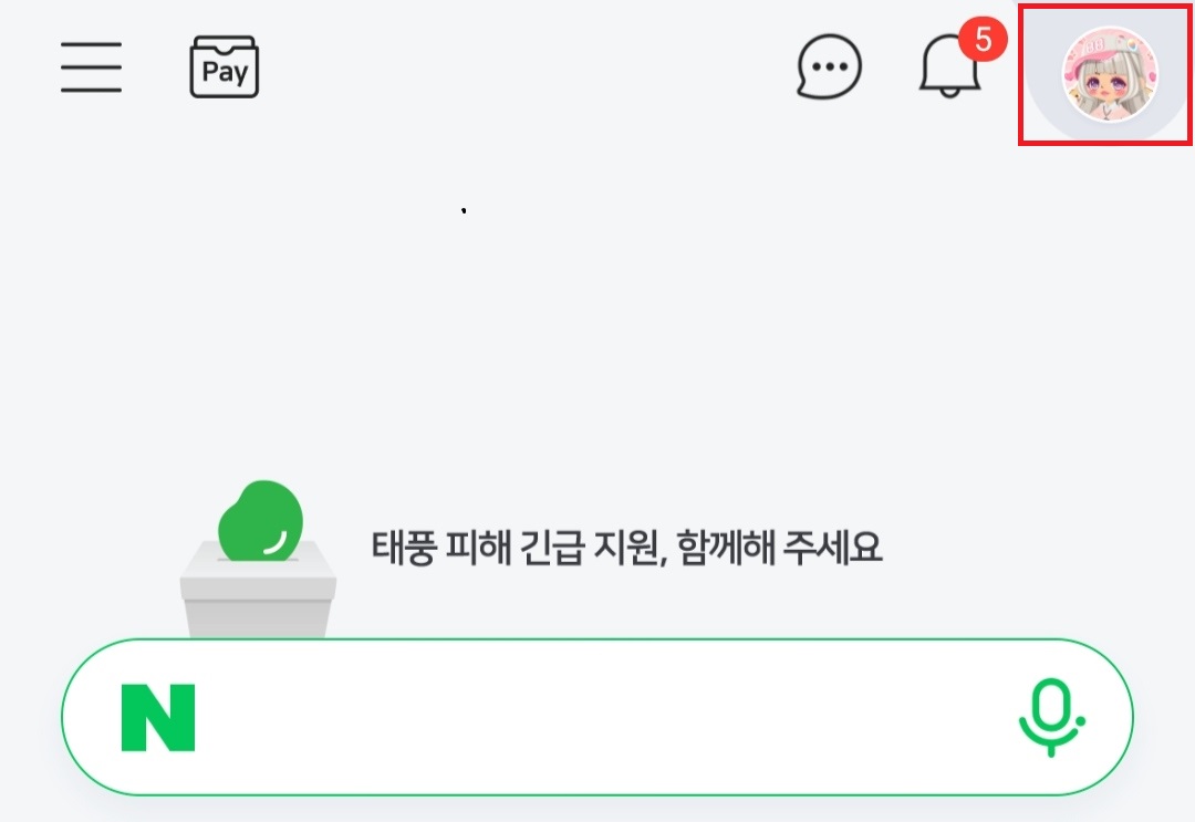 1. 네이버 앱 첫 화면에서 상단 우측의 '프로필'을 클릭합니다.