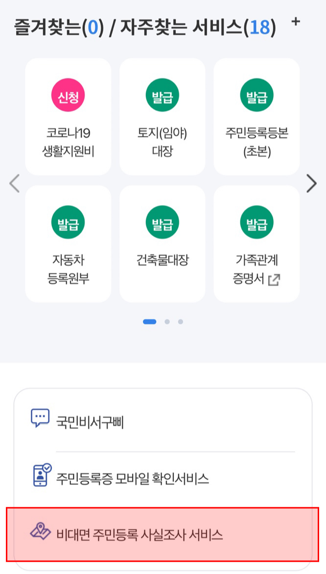 4. 앱 첫 화면에서 스크롤을 내려 '비대면 주민등록 사실조사 서비스' 항목을 클릭합니다.