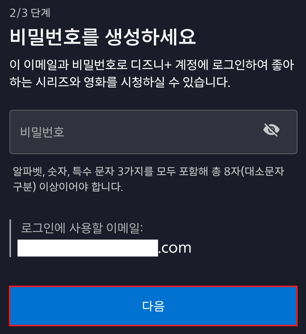 4. 알파벳(대소문자 구분), 숫자, 특수문자를 모두 포함한 8자 이상의 비밀번호를 입력 후 하단의 '다음' 버튼을 클릭합니다.