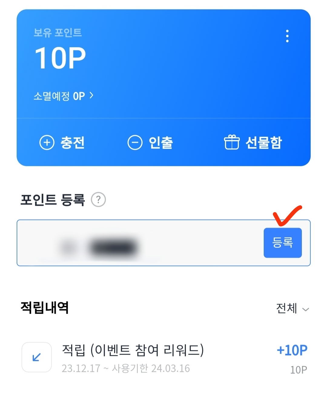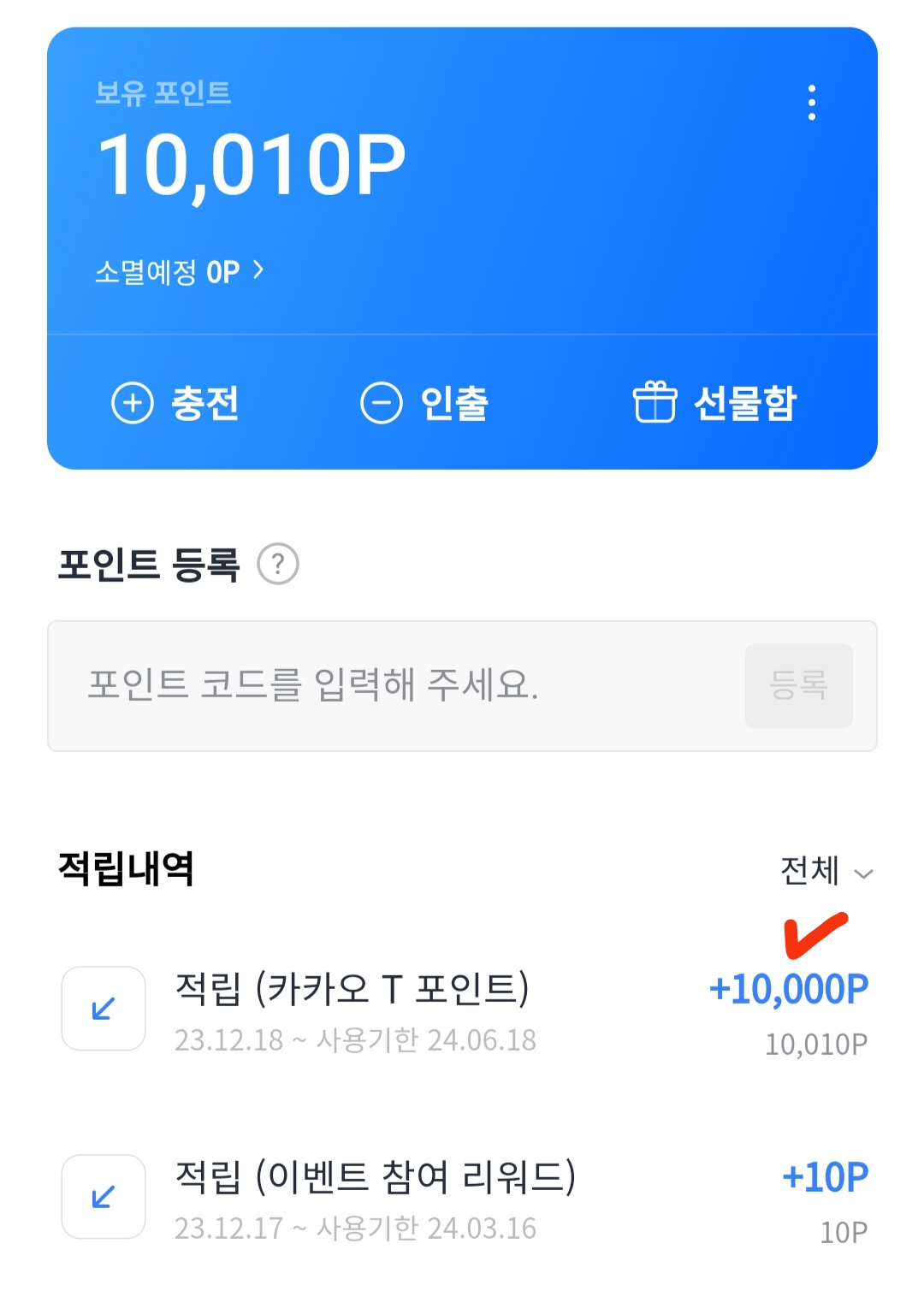 4. 포인트 등록창에 카카오티 포인트 이용권에 적힌 쿠폰번호를 복사해서 붙여넣거나 직접 입력한 다음 옆에 있는 '등록' 버튼을 클릭합니다. 등록한 쿠폰의 등록 여부는 포인트 등록창 아래에 있는 적립내역에서 바로 확인할 수 있어요.