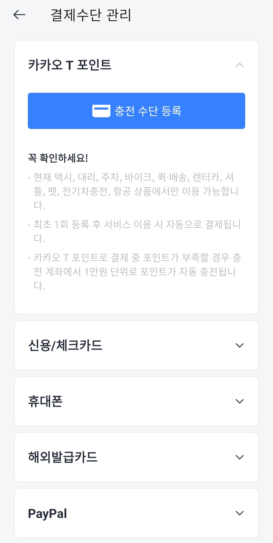 앞으로도 계속해서 결제수단으로 카카오티(카카오T) 포인트를 이용하시려면 '내정보' ---> '결제수단 관리' ---> '카카오T 포인트' ---> '충전수단 등록'으로 들어가셔서 출금계좌를 연결후 이용하시면 됩니다. 1회 등록하시면 추후 결제시 포인트가 부족할 경우 출금계좌에서 1만원 단위로 자동 충전됩니다.
