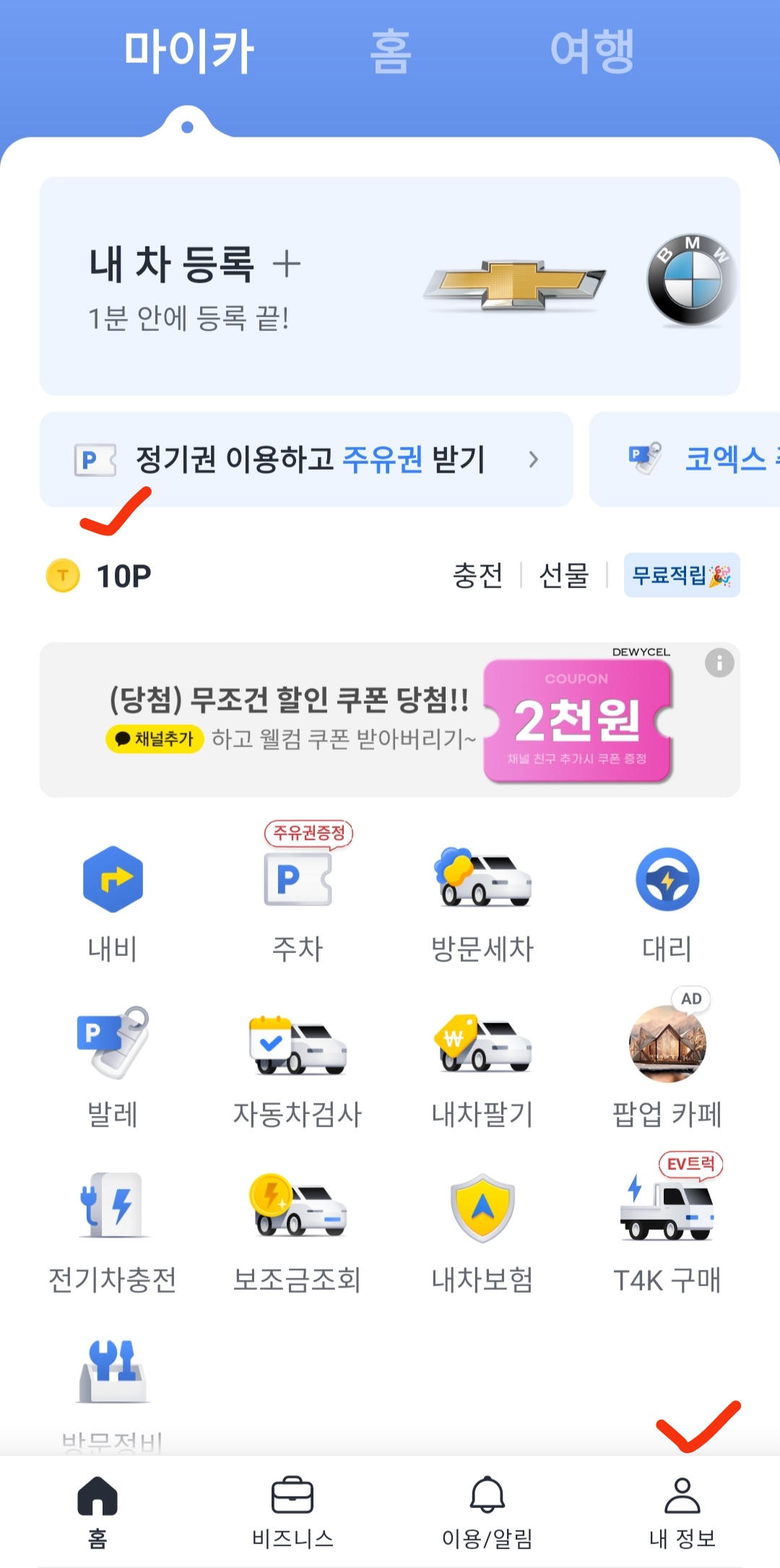 2. 등록 경로는 메인 화면에서 우측 하단에 있는 '내정보'로 들어갑니다. 카카오티 앱을 이용중이신 기존 고객이시라면 상단 배너 아래에 뜨는 충전금액을 클릭하셔도 돼요. (저는 포인트 이용권 등록 전에 무료적립으로 10원을 먼저 받았어요.^^)