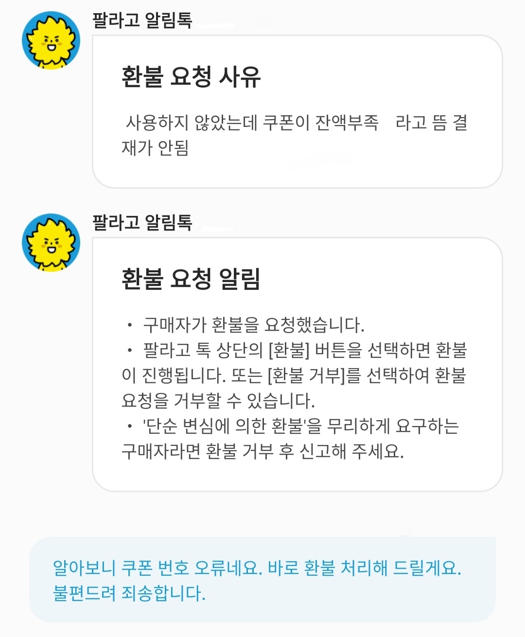 팔라고에서 기프티콘과 모바일 상품권을 판매한지 어느덧 6개월이 되어가는데, 처음으로 환불 요청이 들어왔어요. 순간 가슴이 덜컹~ 뭐가 잘못됐나 하는 의아함과 혹시 말로만 듣던 환불 사기는 아닐까 하는 두려움이 함께 몰려와서 당황스러웠어요.