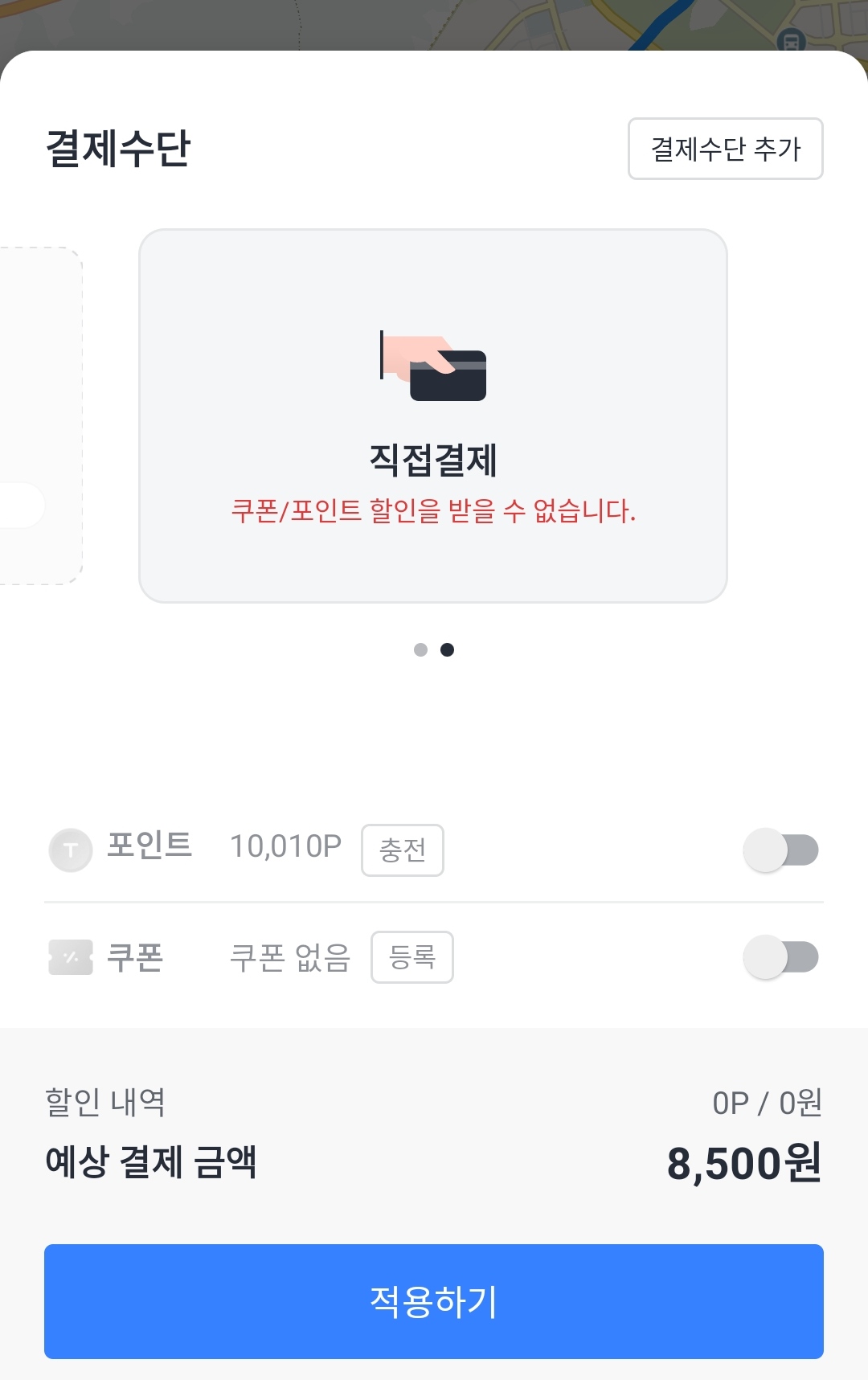 직접결제는 후불결제로 기사님에게 직접 현금이나 카드를 전달해 결제하시면 되며, 쿠폰이나 포인트 할인은 받을 수 없으니 유의하세요.