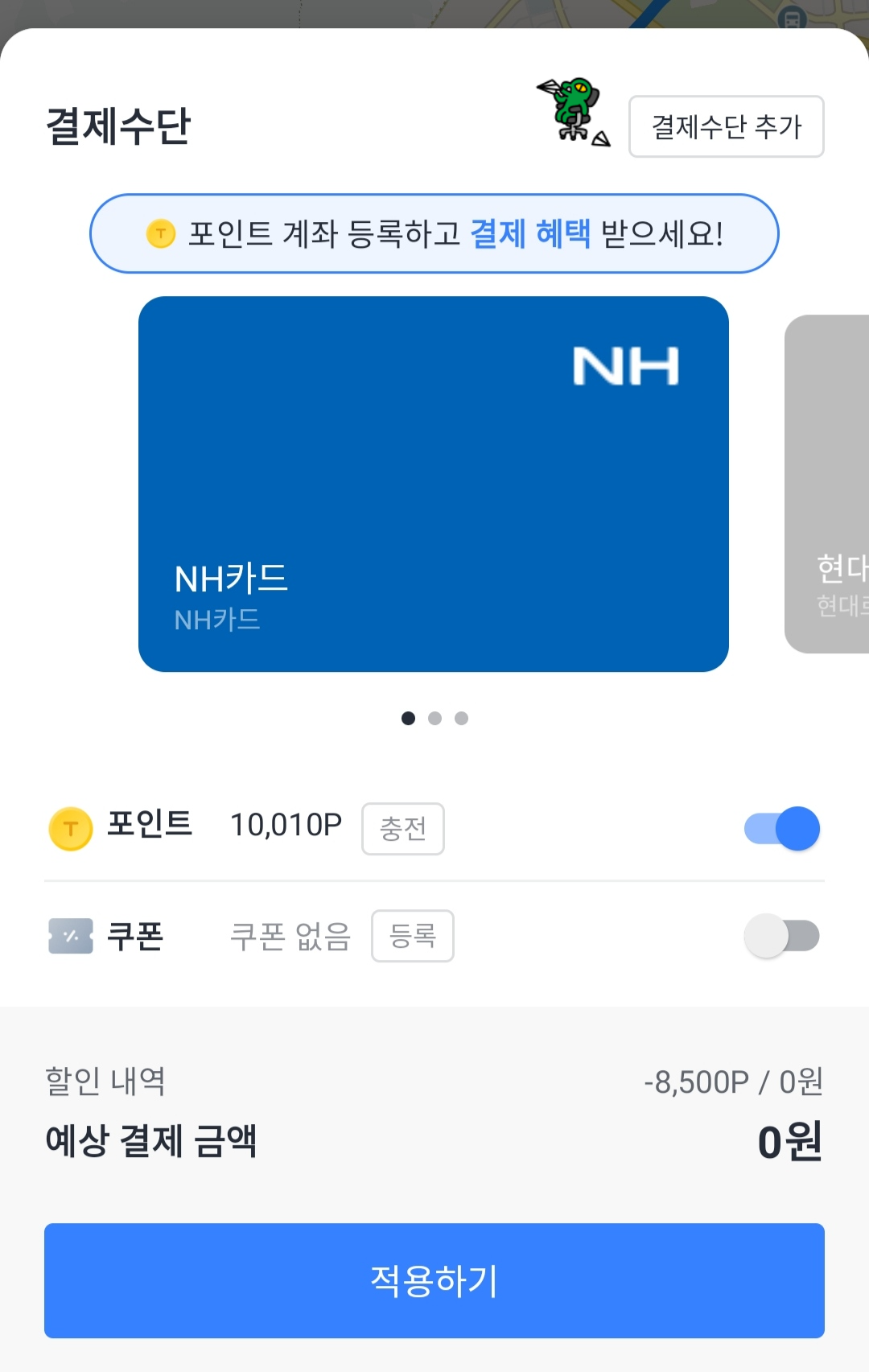 이렇게 카카오티 포인트 이용권을 이용하더라도 추가로 결제수단을 등록해야만 포인트를 사용할 수 있고, 아니면 포인트 옆의 설정 버튼이 아예 활성화 되지 않아요.