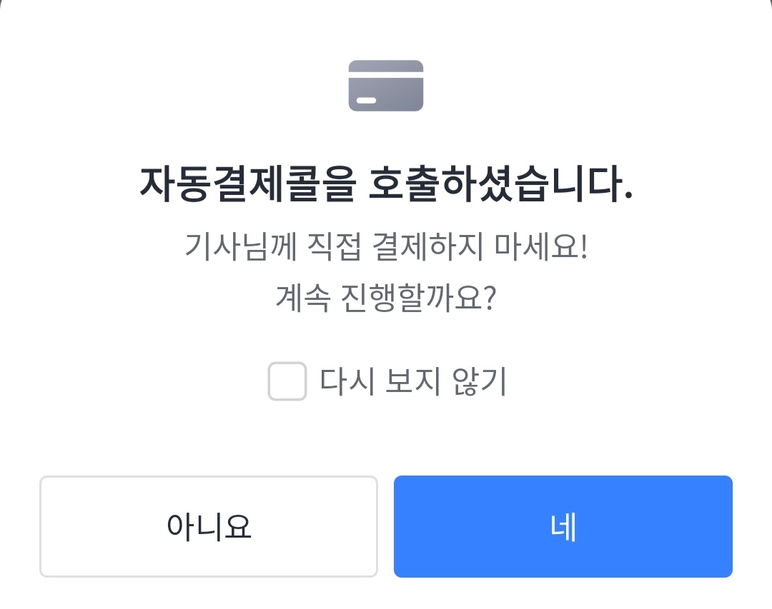 자동결제는 선불결제이므로 기사님께 직접 결제 하지 말라는 주의 메시지 창이 뜨면 '네'를 클릭합니다.