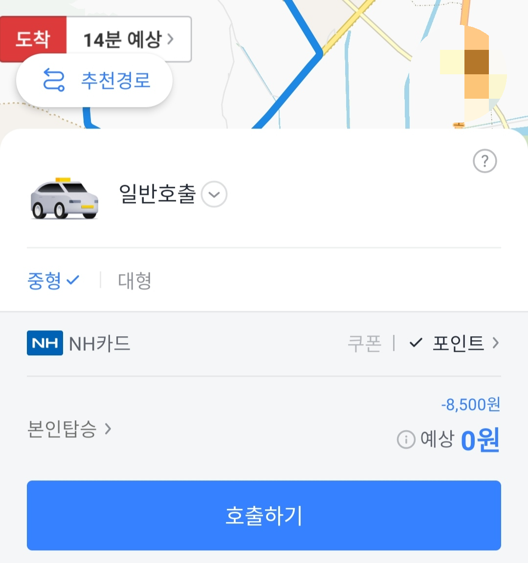 추가 결제수단까지 등록하고 나면 호출한 택시와 도착 예정 시간, 이동경로, 결제 수단, 예상 결제 금액 등이 표시되며, 맞으면 '호출하기'를 눌러주심 돼요.