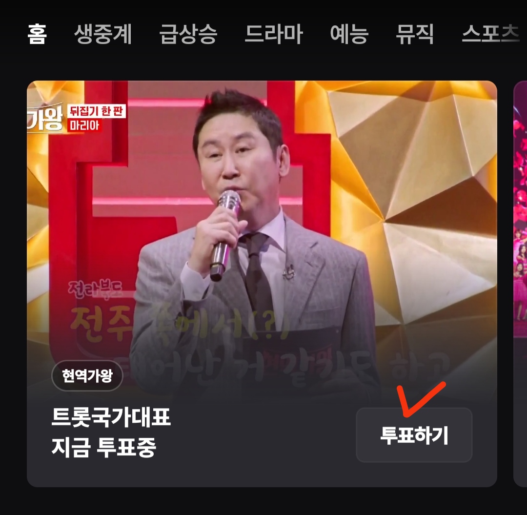 2. 앱을 열고 첫 화면 상단의 '홈' 목록에서 현역가왕 투표하기 화면을 찾아주세요.