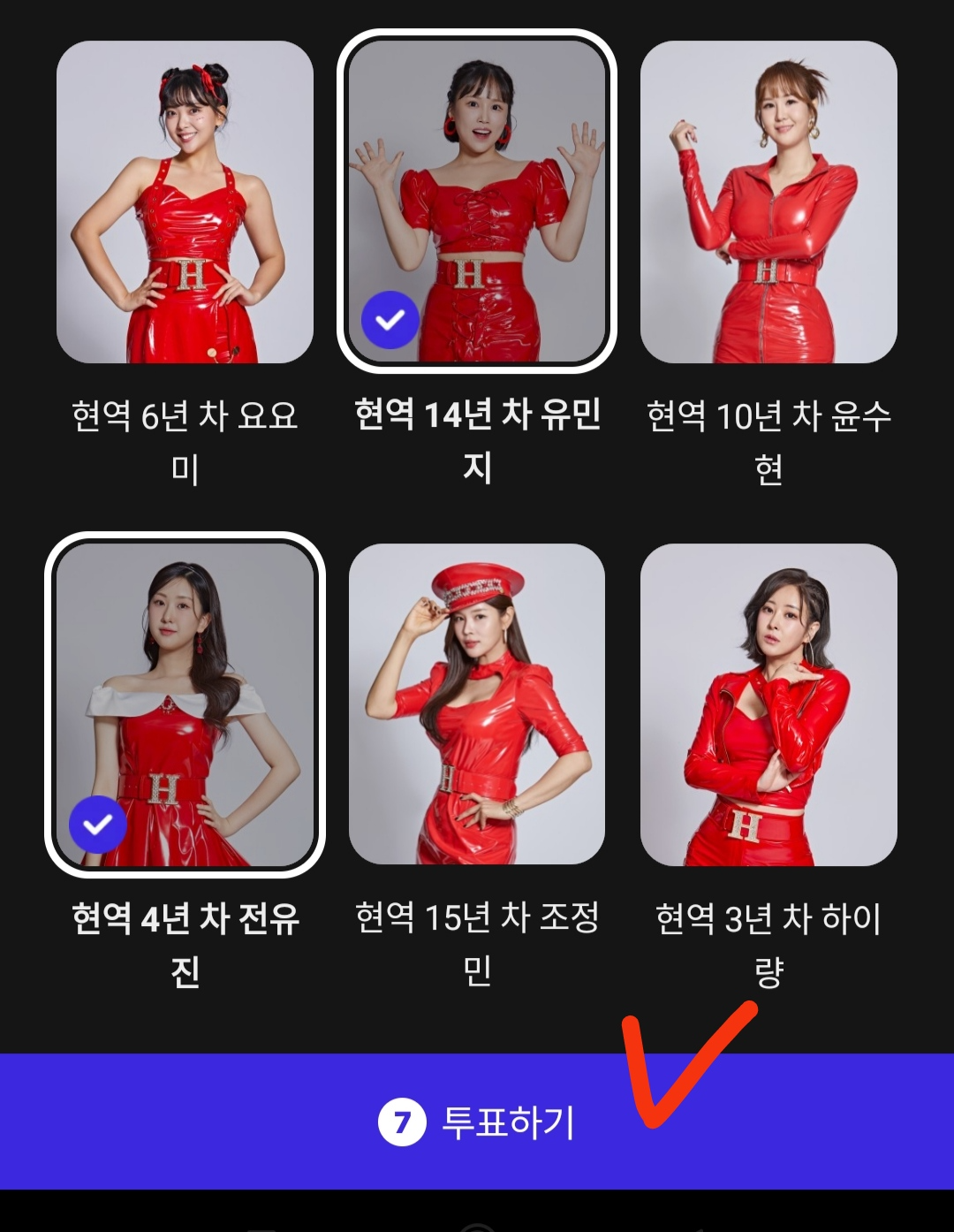 5. 이상 24명의 후보 중 응원하시는 후보 7명을 선택한 다음 '투표하기' 버튼을 클릭하시면 투표 완료입니다.