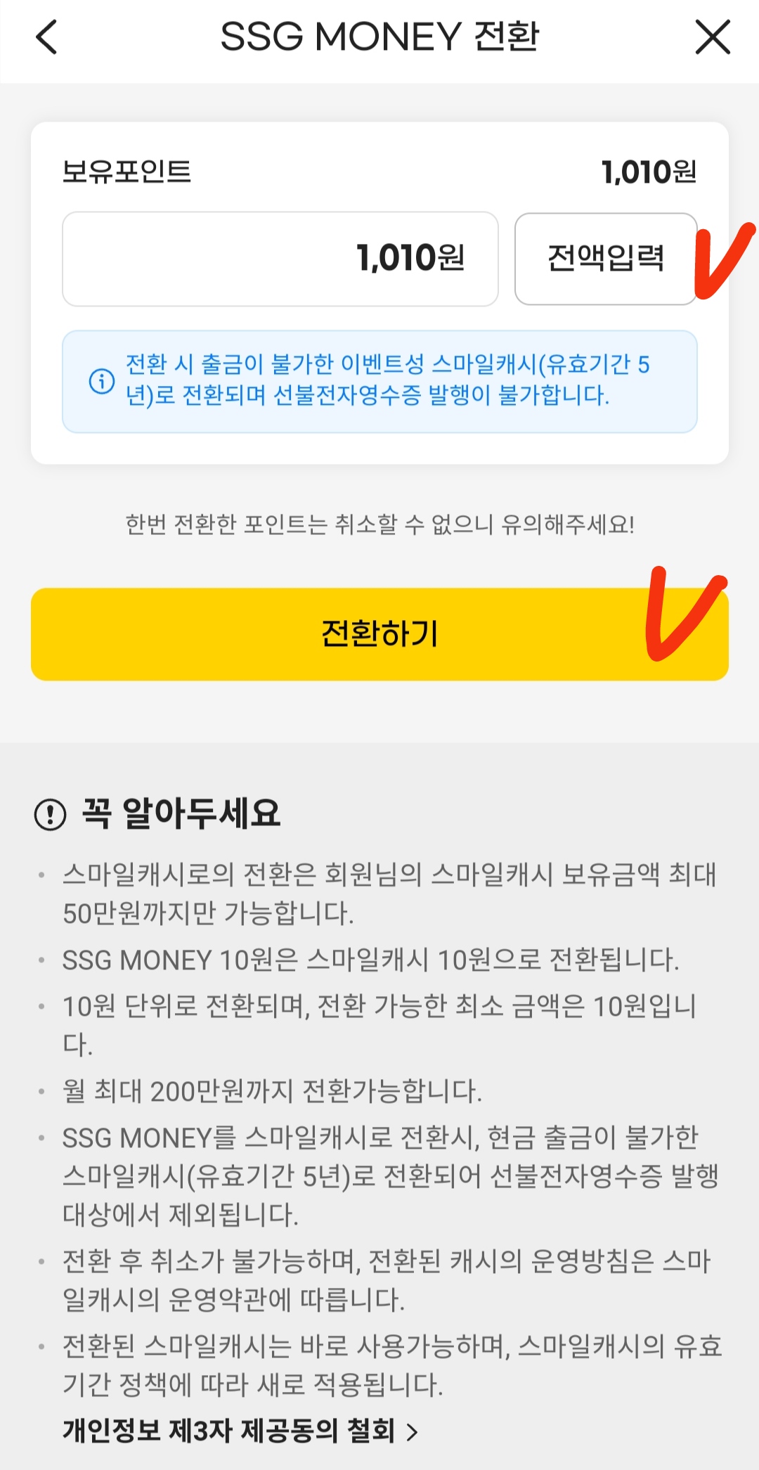 이벤트성 쓱머니의 유효기간이 짧은 경우 이렇게 스마일캐시로 전환하면 유효기간이 5년으로 늘어나니까 꼭 기억해두세요!! ^^