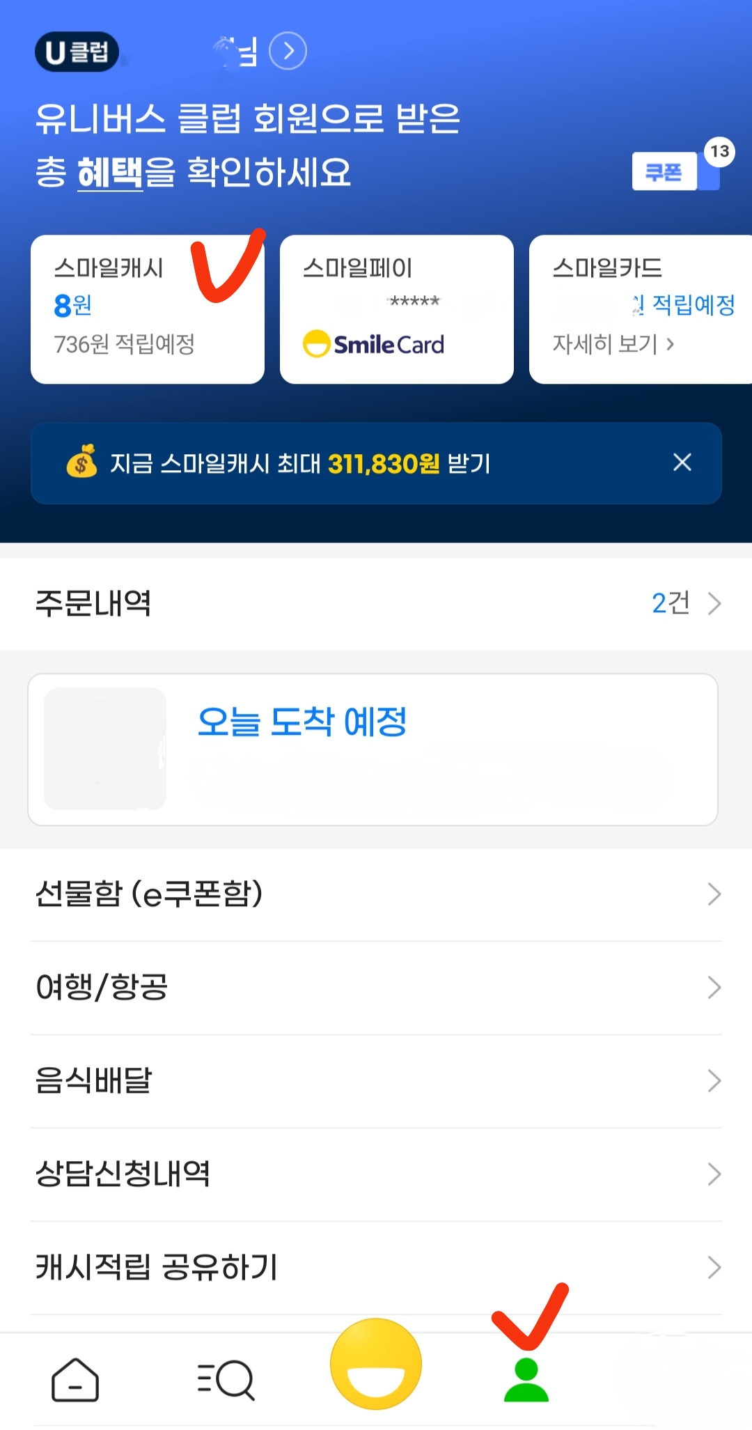 6. 이제 지마켓으로 이동하여 하단의 사람 모양 아이콘으로 들어가 상단에 있는 '스마일캐시'를 클릭합니다.