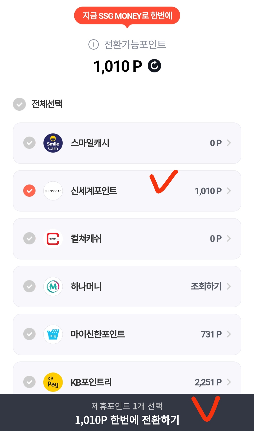 2. 전환가능 포인트 목록에서 '신세계포인트' 또는 하단의 '제휴포인트 1개 선택 OOOOP 한번에 전환하기'를 클릭합니다.