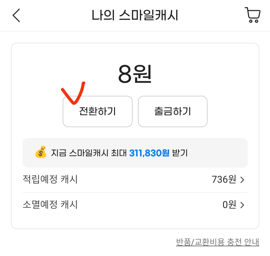 7. 나의 스마일캐시 페이지에서 '전환하기'를 클릭합니다.