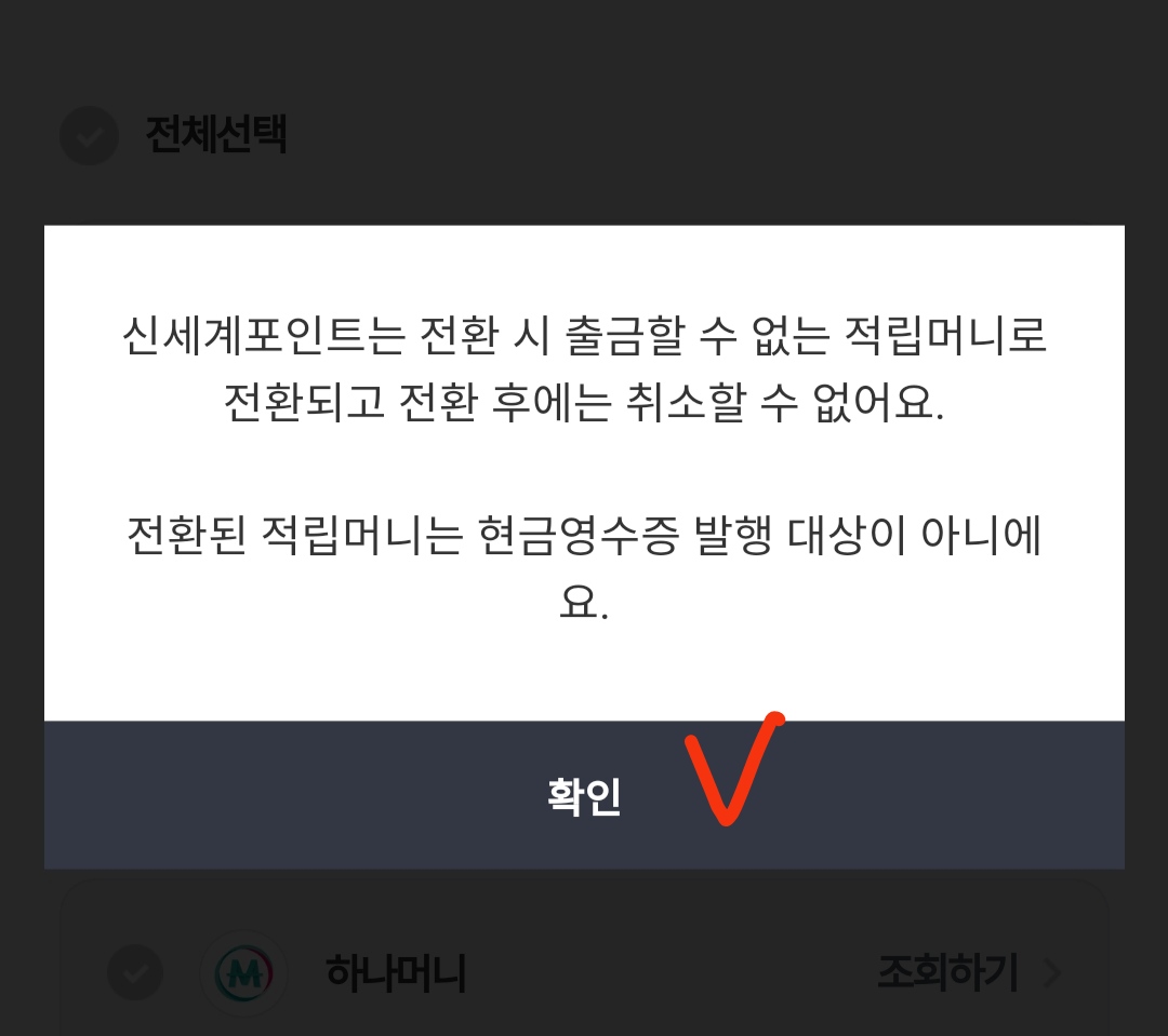 3. '신세계포인트는 전환 시 출금할 수 없는 적립머니로 전환되고 전화 후에는 취소할 수 없어요. 전환된 적립머니는 현금영수증 발행 대상이 아니에요' 라는 안내 메시지가 뜨면 '확인'을 클릭합니다.