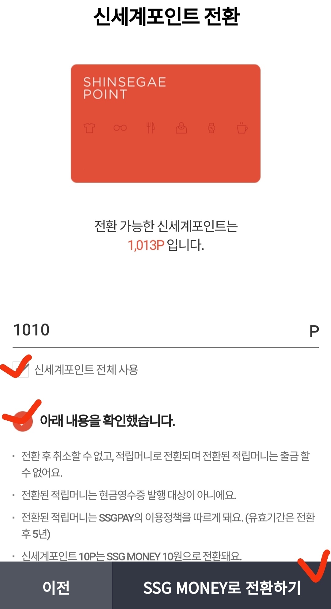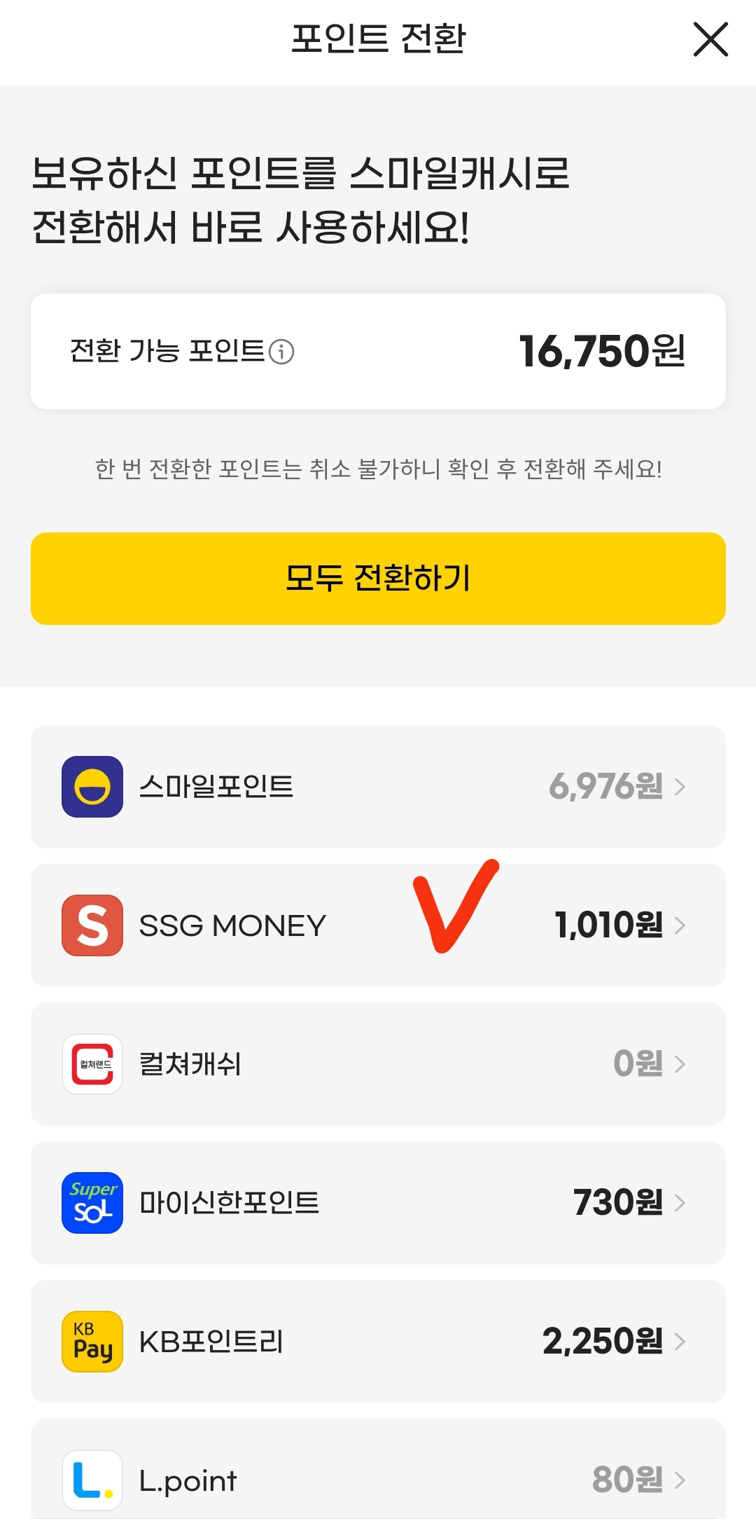 8. 포인트 전환 목록에서 'SSG MONEY'를 선택, 다음 단계에서 보유 포인트 내에서 전환할 금액을 입력하고 '전환하기'를 클릭합니다.