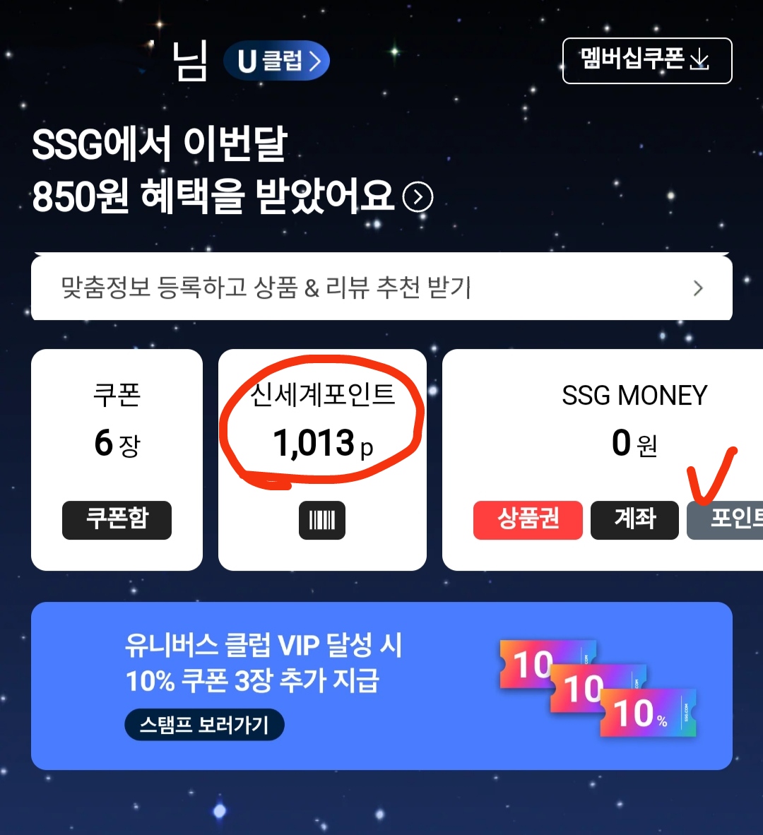 1. 쓱닷컴에 접속해 신세계포인트 금액을 확인한 다음 쓱머니에서 '포인트'를 클릭합니다.