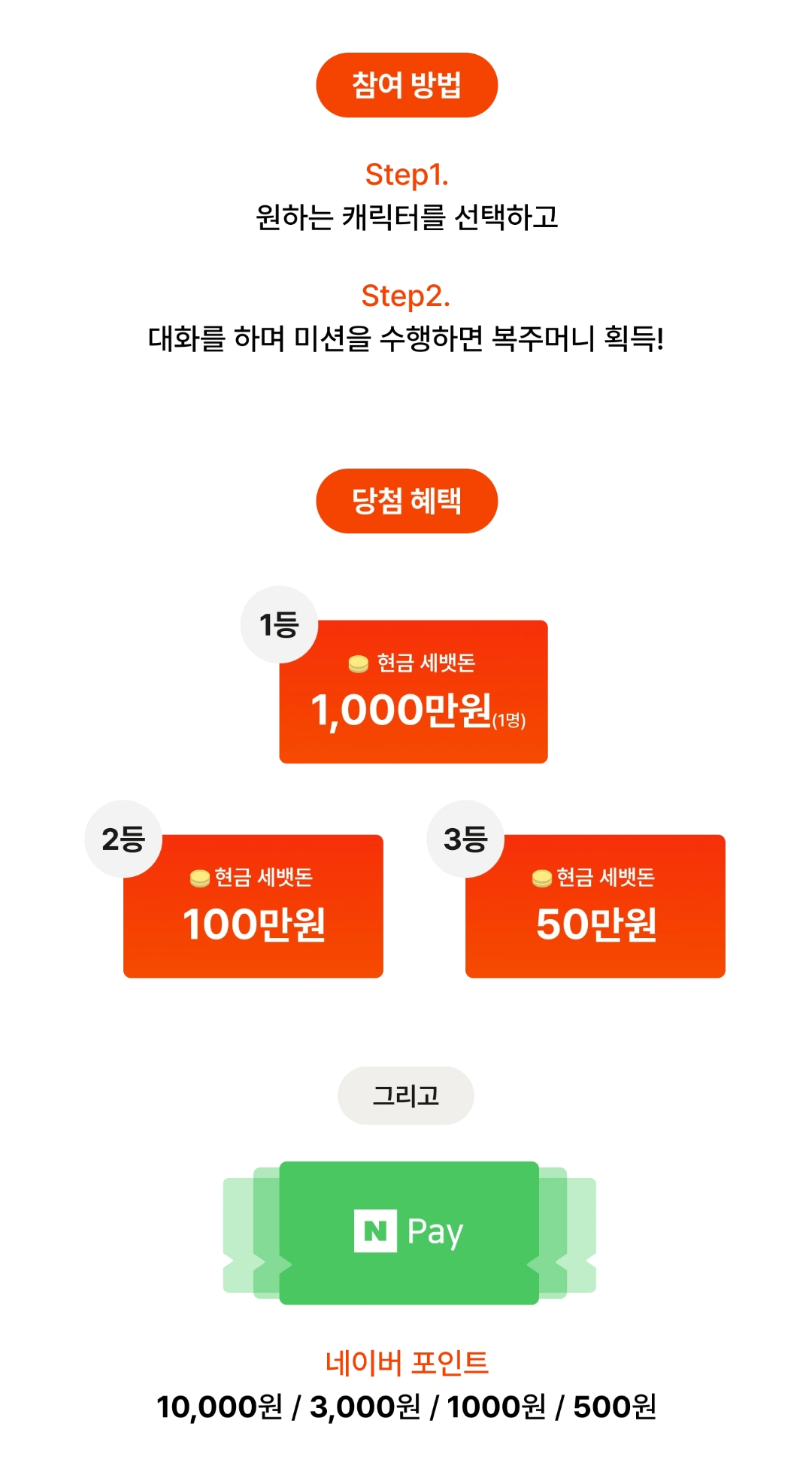 원하는 캐릭터와 대화를 종료하고 나면 주는 복주머니를 열면 500원 / 1000원 / 3000원 / 10000원 중에서 랜덤으로 네이버페이가 지급돼요. 1등은 현금 1,000만원, 2등은 100만원, 3등은 50만원 준다는데 과연 행운의 주인공은 누구실까요??