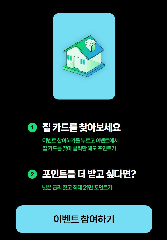 세 번째는 주택담보대출비교 이벤트인데, 대출비교 안 하고 그냥 '이벤트 참여하기' 버튼 누른 다음 집 모양 카드 찾아서 클릭하면 즉시 네이버페이 줘요. 기간은 2월 29일까지입니다.