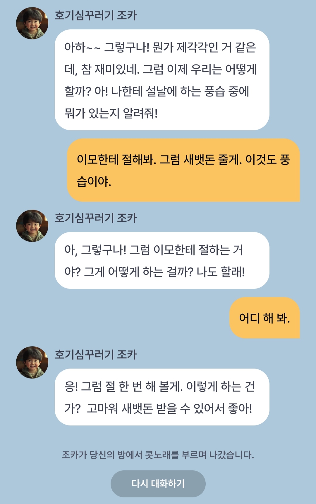 저는 조카와 대화를 나누었는데, 대화 나누기 어려우신 분들은 참고하세요.^^