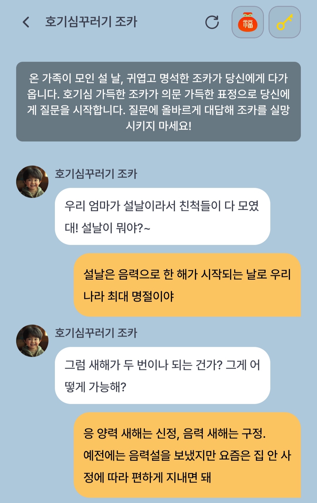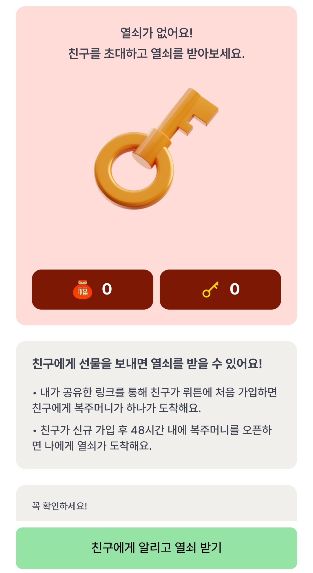 친구 초대하면 복주머니를 한 번 더 열 수 있는 열쇠를 하나준다고 하니 대화 종료 후 가족이나 친구에게도 알려주세요.^^