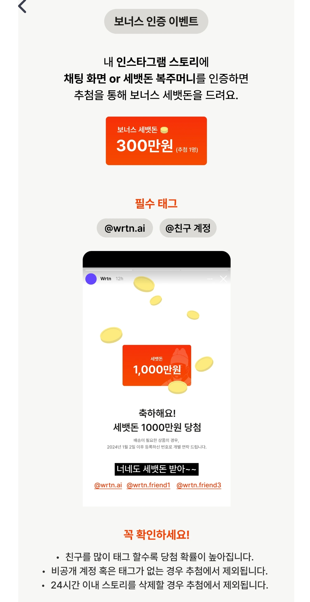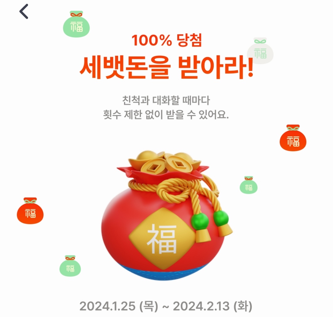 보너스 이벤트로 인스타그램 스토리에 캐릭터와 대화 나눈 채팅 화면 또는 세뱃돈 복주머니를 필수 태그와 함께 인증하면 1명을 추첨하여 300만원을 준다고 하니 관심있으신 분은 참여해 보세요.