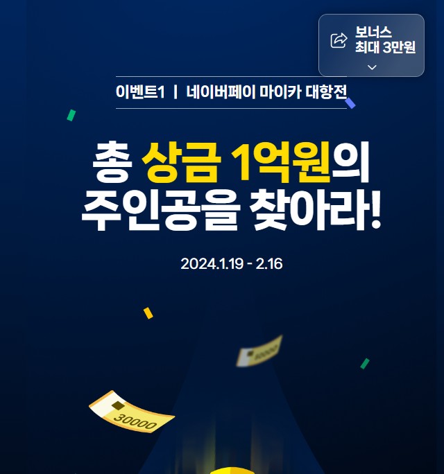 2월 16일까지 진행되는 이벤트로 페이지 접속하자마자 우측 상단에 있는 '보너스 최대 3만원' 버튼 누르시면 랜덤으로 바로 지급돼요.