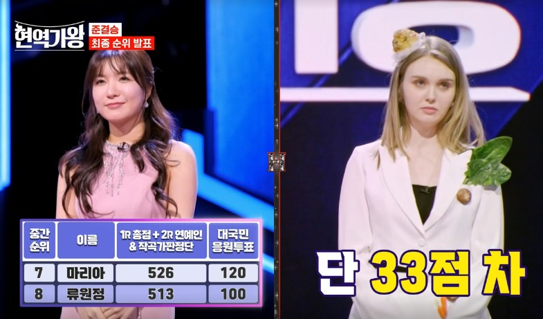 잔인하게도 9위와 10위 발표를 가장 나중에 하였는데, 8위였던 류원정은 7위 마리아와의 33점 차를 극복하지 못하고 탈락 후보가 되었답니다.ㅜㅜ