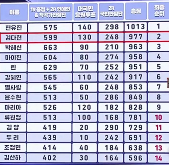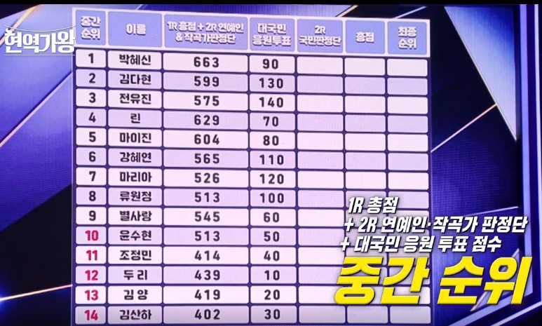 준결승전 부터는 대국민 응원투표 점수가 더해졌는데요, 1라운드 총점+2라운드 연예인&작곡가 판정단의 점수와 대국민 응원투표 점수가 더해진 중간 순위는 1위 박혜신, 2위 김다현, 3위 전유진, 4위 린, 5위 마이진, 6위 강혜연, 7위 마리아, 8위 류원정, 9위 별사랑, 10위 윤수현, 11위 조정민, 12위 두리, 13위 김양, 14위 김산하 였으나, 여기에 2라운드 국민 판정단의 점수가 더해지며 역전이 일어났습니다.