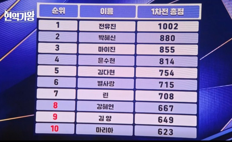 10위 마리아, 9위 김양, 8위 강혜연, 7위 린, 6위 별사랑, 5위 김다현, 4위 윤수현, 3위 마이진, 2위 박혜신, 1위 전유진입니다. 1위를 한 전유진 양은 연예인 판정단 596점, 국민 판정단 306점을 받아 총 902점이었으나 1위에게 주어지는 베네핏 100점이 더해져 총 1002점을 받았어요.