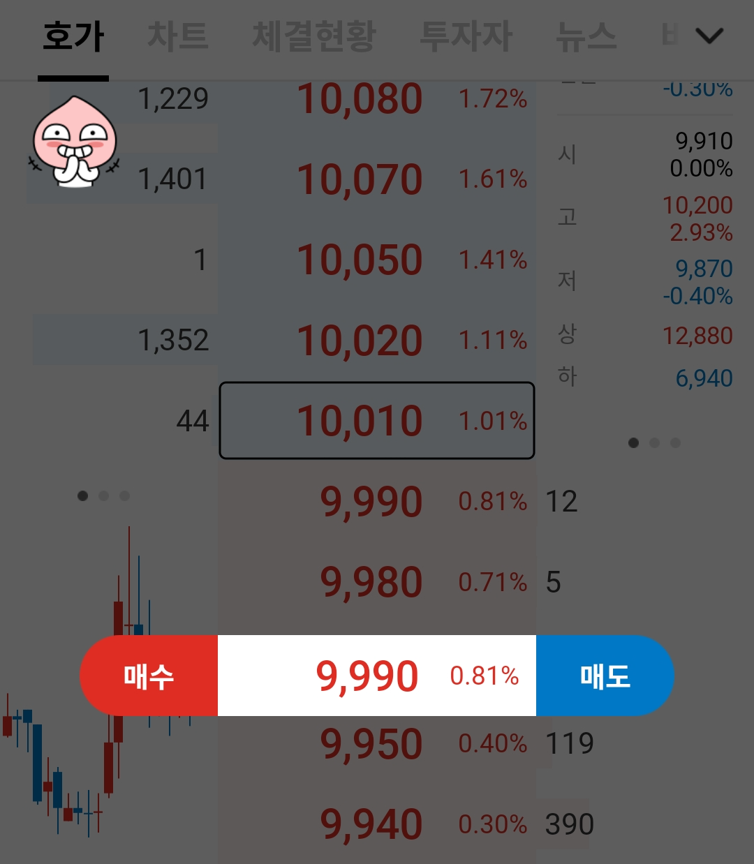 제가 매수할 당시는 9,990원이 파란색(매수창)에서 가장 아래에 있었는데, 저는 유효기한이 있는 1만원권 매수쿠폰을 사용해 매수할 것이기 때문에 더 싸게 사도 의미가 없어서 망설임없이 9,990원을 클릭했어요.