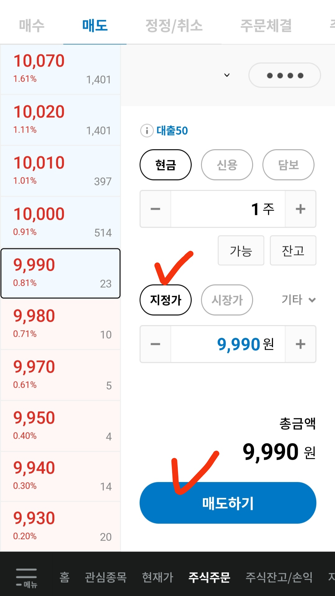 달랑 1주뿐이고 오래 묵혀 둘 거 아닌 이상 몇 십원 올라봤자 큰 이득이 안 되기 때문에 저는 매수했던 가격 9,990원 그대로 매도를 진행했어요. 매도할 주식이 1주뿐이므로 수량은 그대로 두고 '지정가' 선택만 하고 '매도하기' 버튼을 클릭합니다.