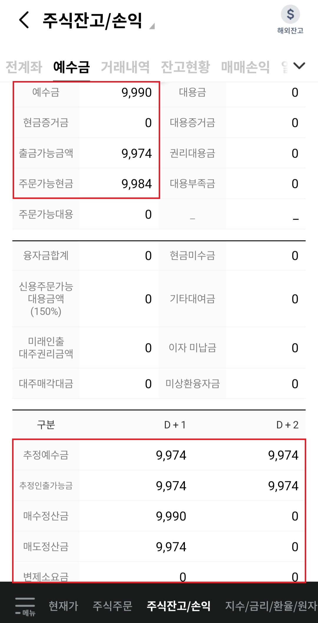 이제 '주식/잔고' 에서 '예수금' 내용을 확인해 봅니다. 이 부분도 처음과 달라져 있을 거예요. 매수와 매도까지 끝낸 당일은 '주문가능현금'에만 금액이 뜨는데, 하루나 이틀 뒤에 확인했을 때 '출금가능금액'에 금액이 뜬다면 이제 출금하셔도 됩니다.