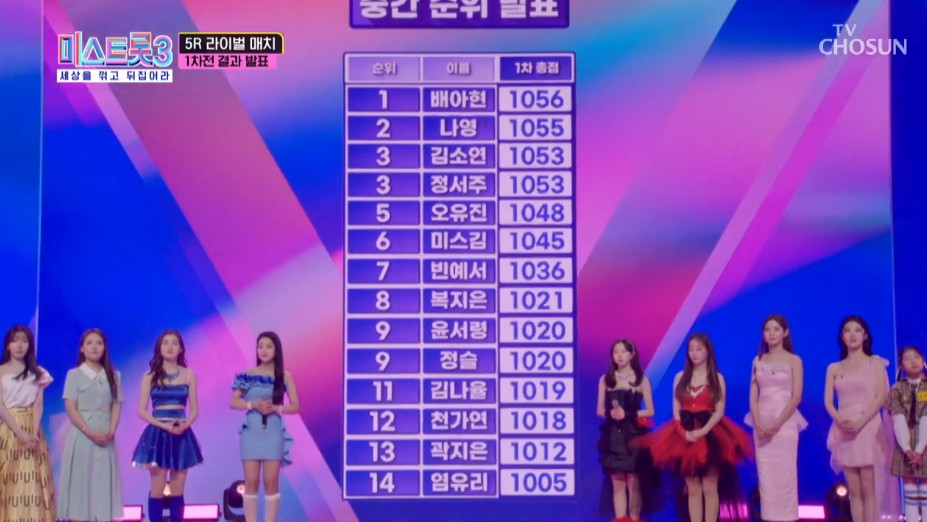 1위 배아현 1056점, 2위 나영 1055점, 공동 3위 김소연 1053점, 공동 3위 정서주 1053점, 5위 오유진 1048점, 6위 미스김 1045점, 7위 빈예서 1036점, 8위 복지은 1021점, 공동 9위 윤서령 1020점, 공동 9위 정슬 1020점, 11위 김나율 1019점, 12위 천가연 1018점, 13위 곽지은 1012점, 14위 염유리 1005점