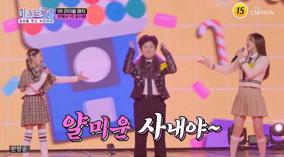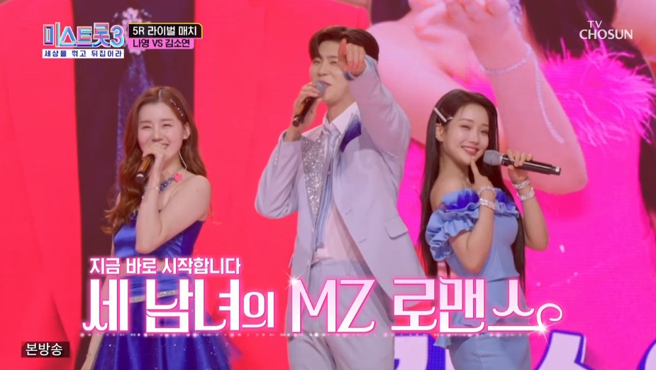 삼각대전 첫 순서는 미스트롯 TOP7 박성온 군과 빈예서 양, 그리고 윤서령 씨가 함께 했어요. 드라마 '꽃보다 남자' 컨셉으로 나왔는데, 너무 귀여웠어요.ㅎㅎ