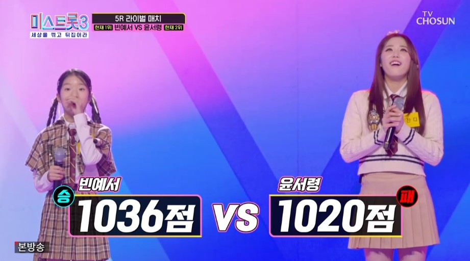 빈예서 1036점, 윤서령 1020점으로 빈예서 양이 16점 더 받았어요.