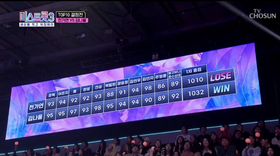 천가연이 하춘화의 '날 버린 남자'를 부르며 첫 무대를 열었고, 천가연의 라이벌 김나율은 노사연의 '돌고 돌아가는 길'을 불렀어요. 그 결과는 천가연 1010점 VS 김나율 1032점으로 김나율의 점수가 더 높았습니다.