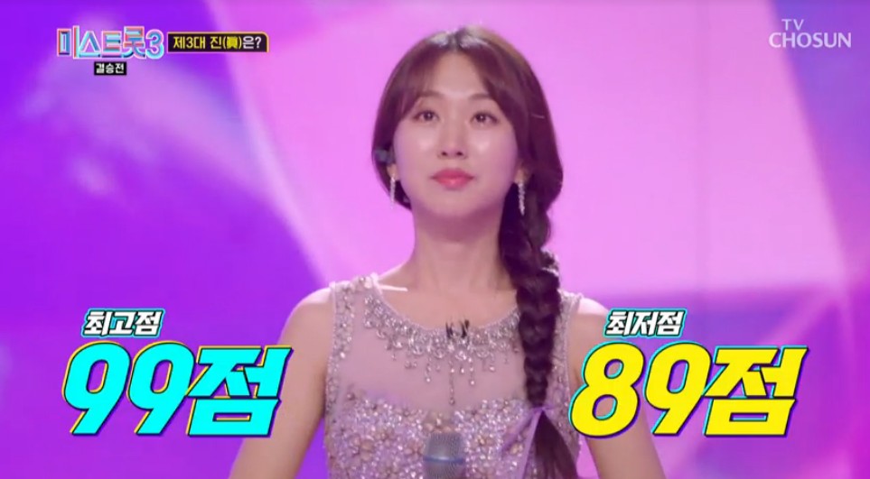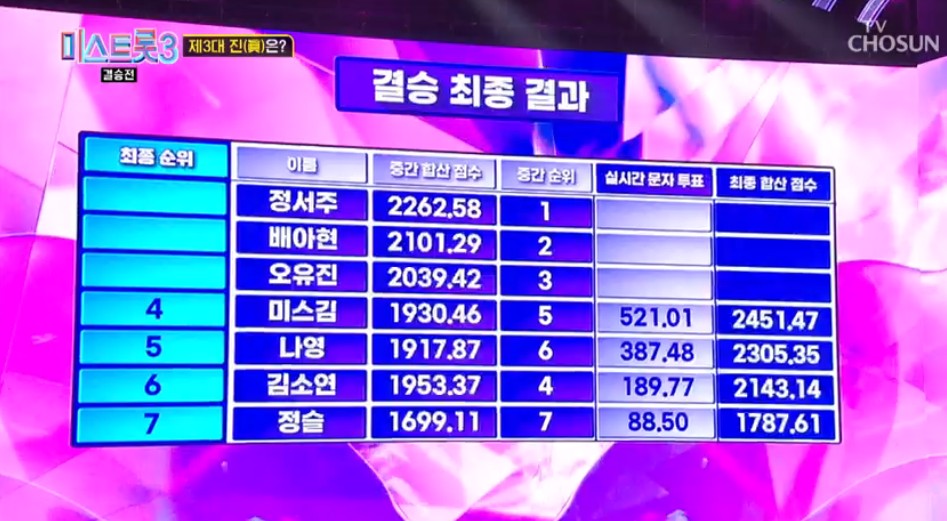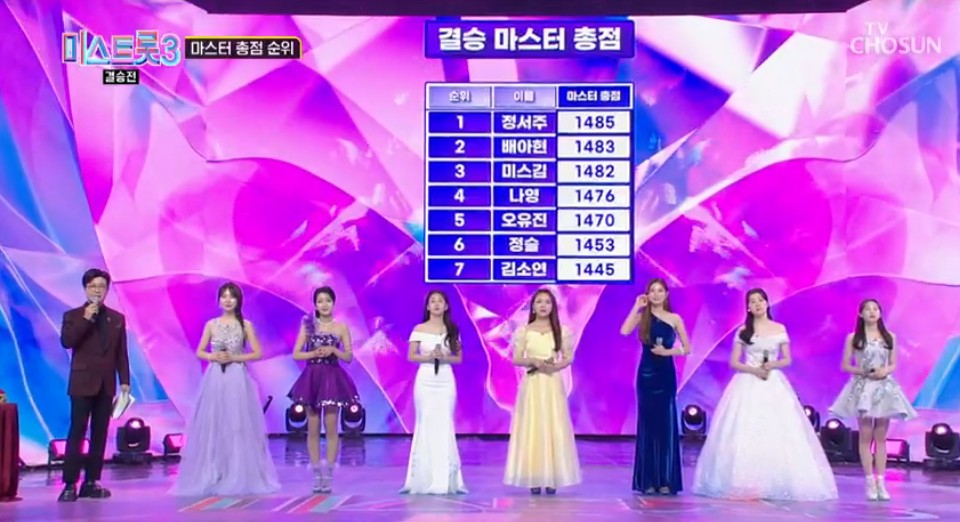 결승전 마스터 총점만으로 나온 순위는 1위 정서주 1485점, 2위 배아현 1483점, 3위 미스김 1482점, 4위 나영 1476점, 5위 오유진 1470점, 6위 정슬 1453점, 7위 김소연 1445점입니다.