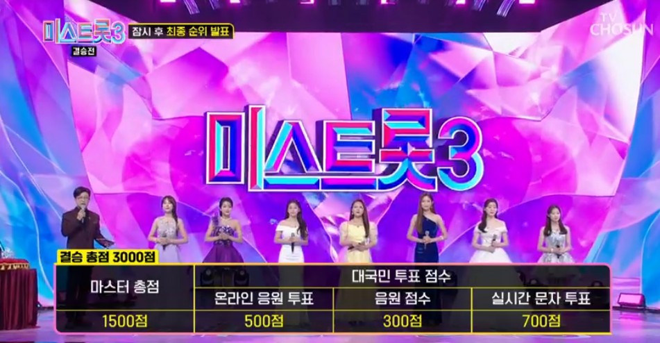 미스트롯3 결승전은 마스터들의 점수 50%(1인당 100점 = 총 1500점)과 대국민 투표 점수 50%(온라인 응원 투표 500점 + 음원 점수 300점 + 실시간 문자 투표 700점 = 총 1500점)을 더한 3000점 만점으로 점수와 순위를 내었어요.