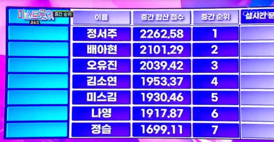1위 정서주, 2위 배아현, 3위 오유진, 4위 김소연, 5위 미스김, 6위 나영, 7위 정슬로 3위부터 7위까지의 순위에 변동이 있었습니다.