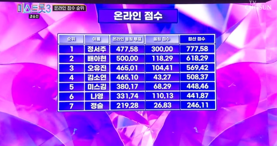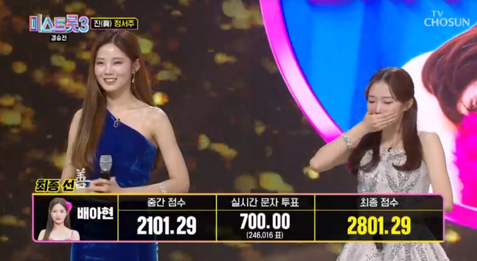 배아현과 정서주와의 실시간 문자투표 점수 차는 139.4점이었는데, 음원 점수의 차이가 더 컸기에 실시간 문자투표 1위의 주인공이 진이 되지 못하고 3위가 진이 되는 이변이 나타났네요.