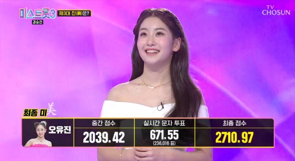 3위 미 오유진은 실시간 문자투표 점수가 671.66점으로 실시간 문자투표 순위로만 본다면 2위였어요.