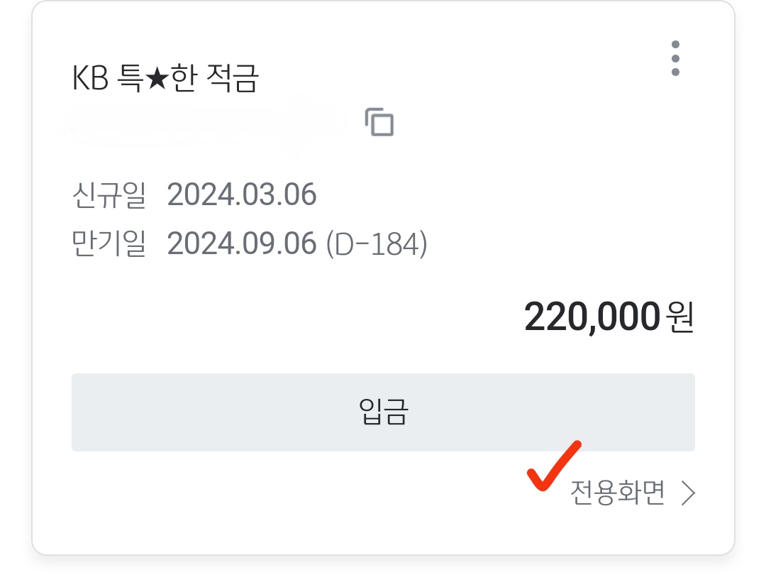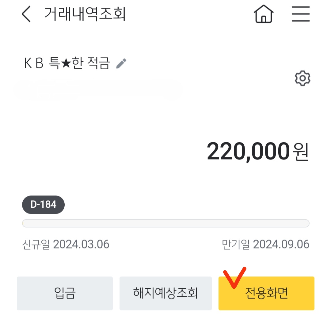 보유하고 계신 계좌 중에서 '특별한 적금'을 찾은 다음 입금 버튼 아래에 있는 '전용화면'을 클릭합니다.